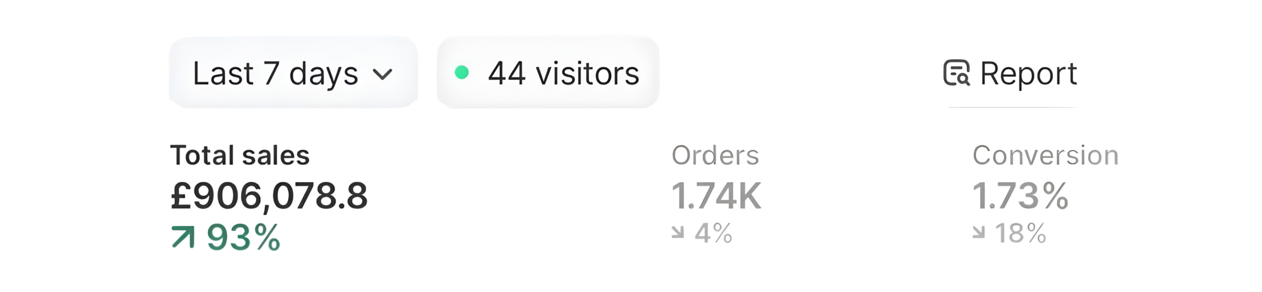 This UK-based Shopify store achieved £906K in total sales, a 93% revenue spike from the start. With 1.74K orders and 1.73% conversion rate, every element of the funnel is dialed in. Orders dipped 4%, but sales jumped 93%, meaning our AOV optimization strategy is working: fewer transactions, higher order value, and more profit. This is the Website Gliders approach: prioritize profit over vanity metrics.