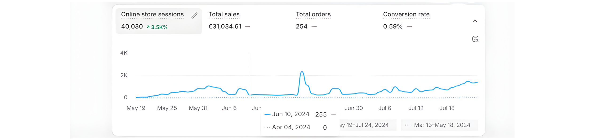 One of our EU partners hit 40K sessions generating €31K revenue with 254 orders. The steady 3.5% growth trajectory shows what happens when you get CRO right—no guessing, no wasted ad spend. Just a clean funnel, optimized pages, and smart retention. 0.59% conversion rate proves the store is working efficiently. This is sustainable Shopify growth.