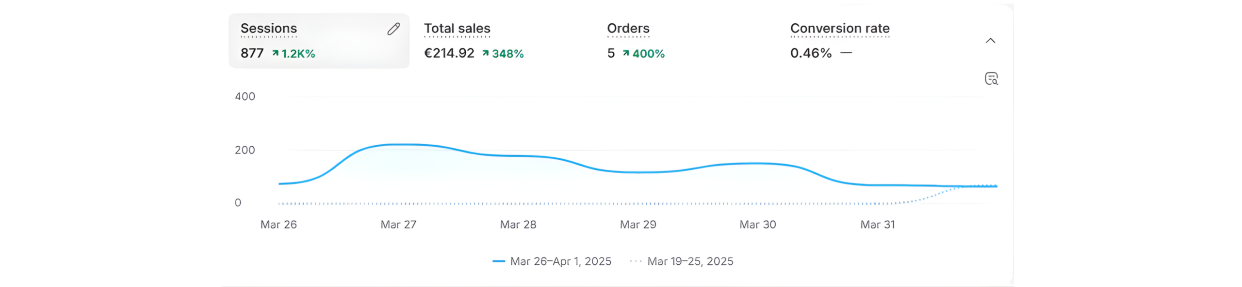 Within the first week of optimization, we identified checkout friction and missing upsell opportunities. By implementing a streamlined product page layout and adding strategic bundles, this Shopify store saw immediate traction. In just 7 days, total sales jumped 348%, orders increased 400%, and sessions grew steady at 1.2K+. The conversion rate scaled from near-zero to consistent daily revenue. This is what data-driven CRO looks like in action.